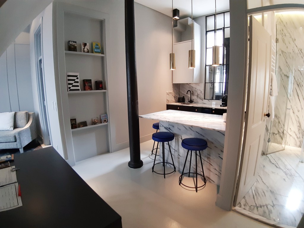 Our apartment is located at the top of Bairro Alto, a bohemian district in the heart of Lisbon, near the Principe Real garden and the Miradouro Sâo Pedro de Alcantara. This ideal location, in the heart of a very pleasant area, allows you to easily discover all the attractions of the center of Lisbon. In the evenings, you will find a large selection of restaurants and bars for dining and entertainment. As the room is on the courtyard side you can sleep in peace and recover from your beautiful walks. Renovated in 2018 with taste by a talented Portuguese interior designer, you will feel at ease. With its very functional kitchen and its many storage spaces, it is suitable for short or long stay. Perfect for a romantic getaway or a single. The apartment consists of an elegant living room with an open kitchen.