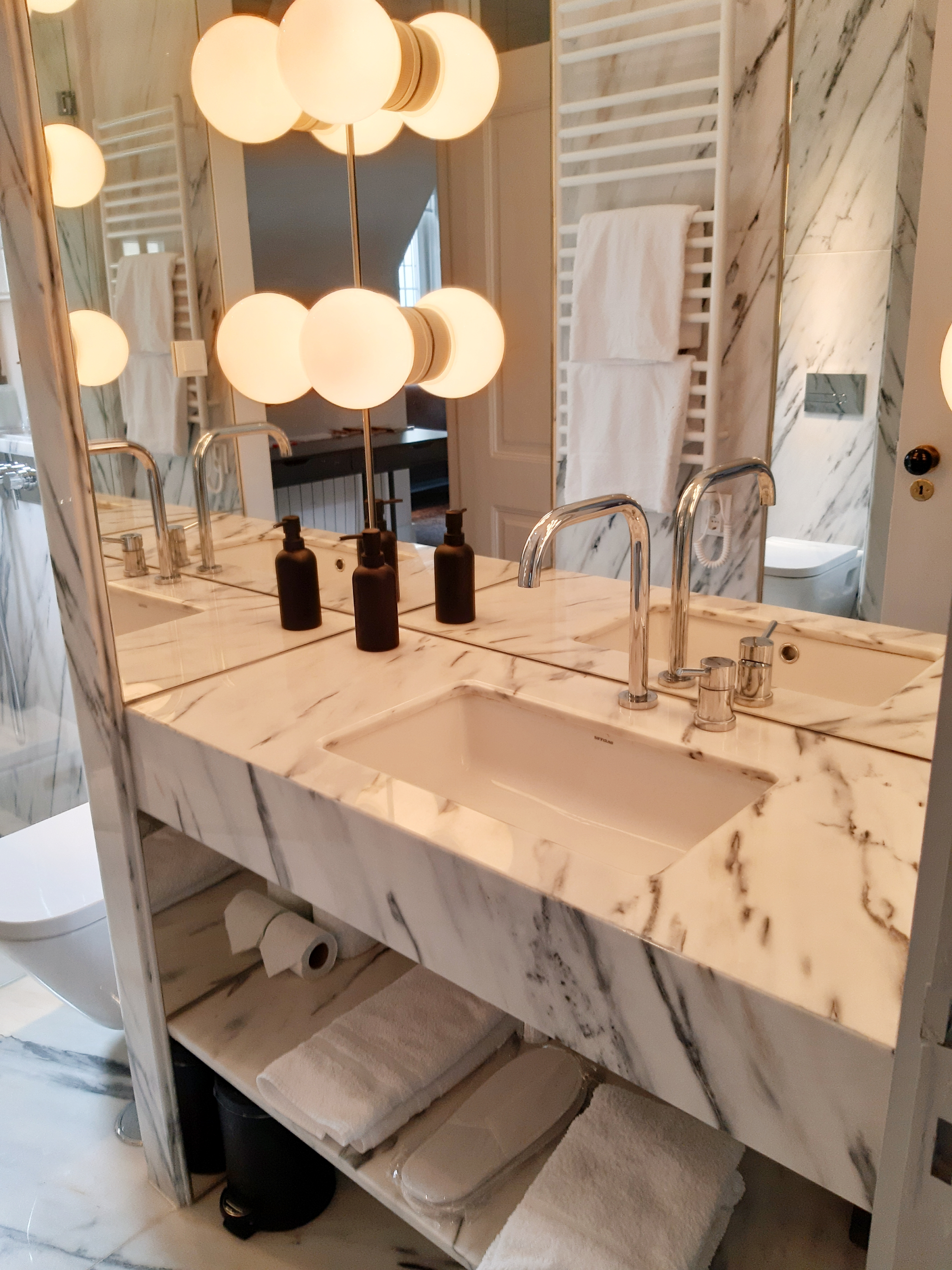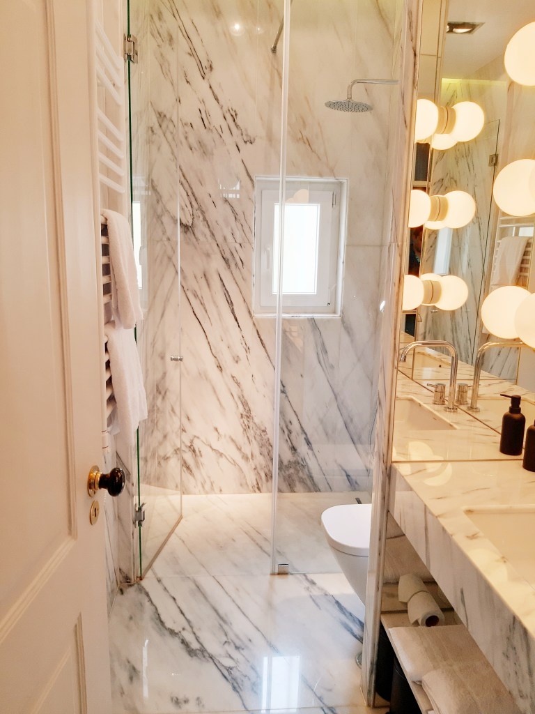 and a beautiful marble bathroom with a large walk-in shower.